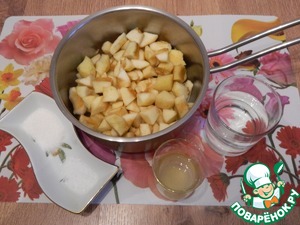 Добавим к яблокам сахар, соль, сок лимона, воду, притушим до готовности.