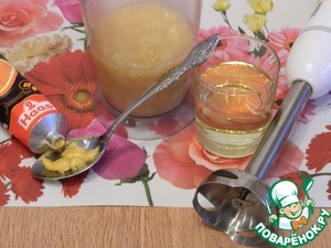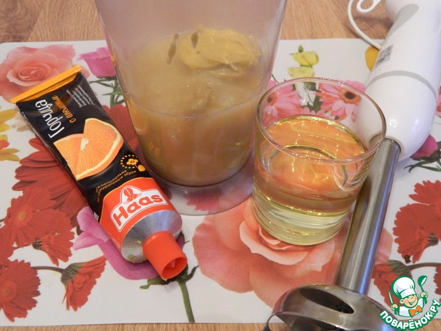 Добавим горчицу, масло растительное. Взобьем блендером до однородной массы, соус в процессе взбивания загустеет, дадим остыть.
