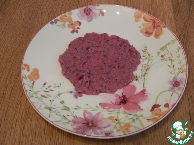 Подложка из лука готова, выложим ее на тарелку. У меня две порции, поэтому луковую основу под салат разделила на 2 части.