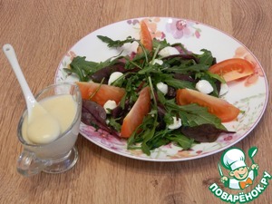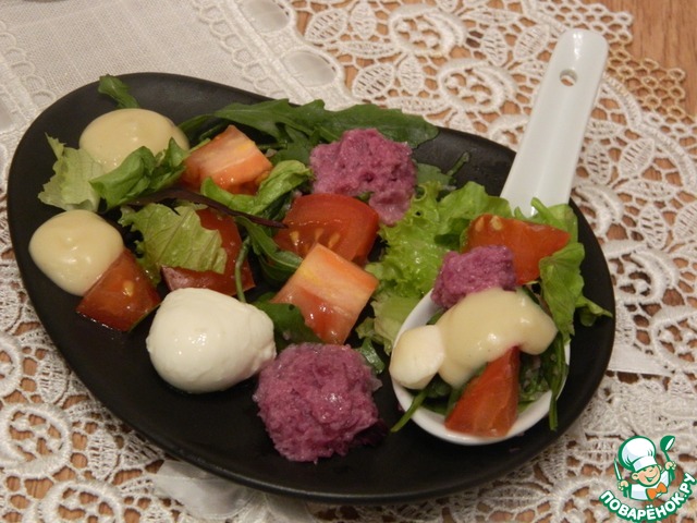Сверху выкладываем листья листового салата и остальную моцареллу. Салат готов. Соус добавляем непосредственно перед употреблением салата.