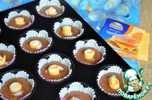 Тесто разлить в формочки, на 1/3, сырок скрутить рулетом и поместить в центр теста.