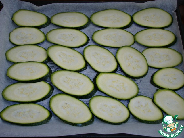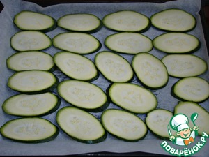 Цукини нарезать на тонкие слайсы и запечь в духовке до мягкости, чтобы при сворачивании они не сломались.