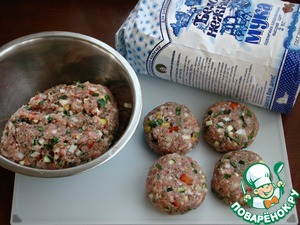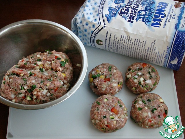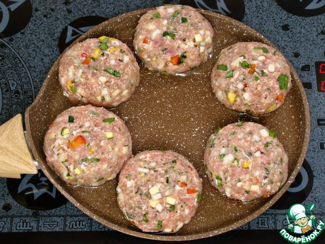 К мясному фаршу добавить яйцо, мелко нашинкованный репчатый лук, соль, специи, панировочные сухари, измельченную зелень петрушки и немного свежих овощей. Фарш тщательно перемешать и сформовать 8 котлет.