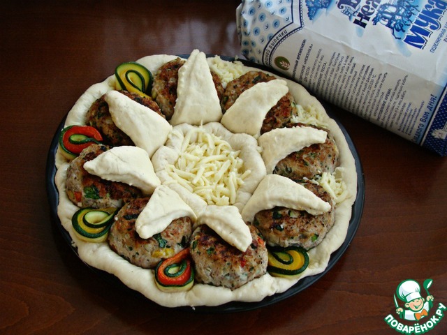По кругу разложить котлеты и накрыть лепестками теста. В середину вложить круг теста, раскатанный из оставшейся части и наполнить тертым на крупной терке, сыром моцарелла.
