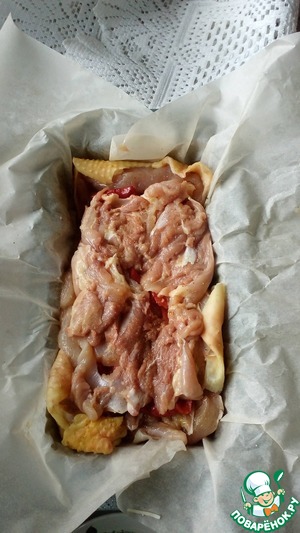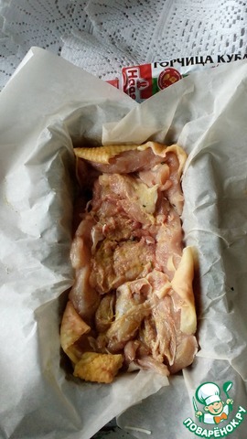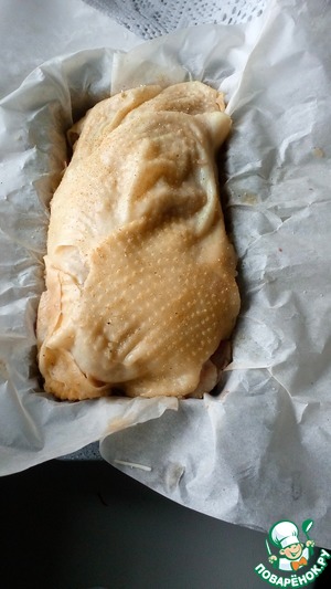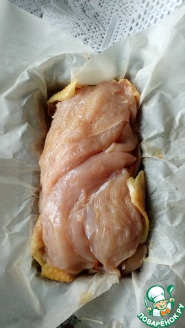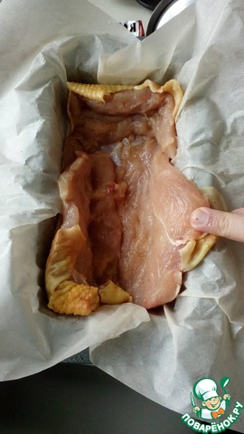 Я готовлю из домашней курицы-бройлера. Весила она 2,5 кг. Отделяю грудку вместе с кожей и нарезаю вдоль на пласты. Грудка затянула на 850 г. С окорочков аккуратно снимаю кожу (она нам понадобится), отделяю мясо от костей.