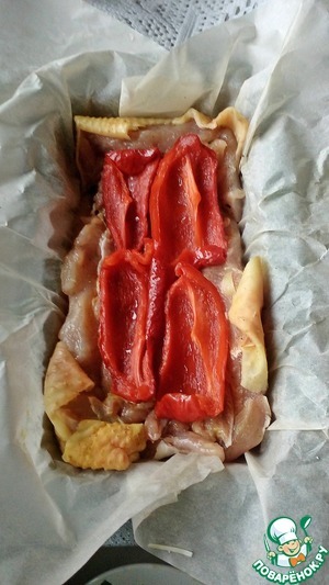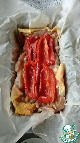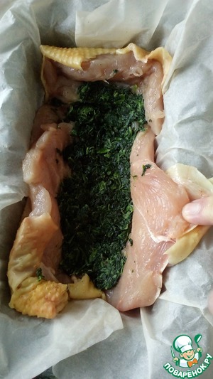 Рулет я собираю в продолговатой форме. Её нужно застелить бумагой для выпечки. Бумаги нужно брать с избытком, чтобы в неё можно было плотно завернуть рулет. Дно я смазала смальцем и положила листики розмарина.