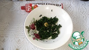 Шпинат нарезать. Добавить соль, 1 ч. л. горчицы, перемешать.