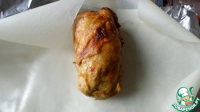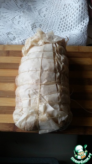 Запекать 60 - 90 минут при температуре 190-200С, снизить температуру до 160-165С и запекать ещё 60 минут. Раскрыть рулет и зазолотить его под грилем минут 5. Если у вас духовка без гриля, то раскрыть рулет нужно раньше, чтобы корочка успела зазолотиться. -