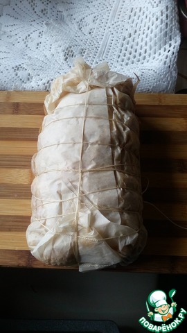 Плотно завернуть рулет в бумагу, обвязать нитками, затем обернуть фольгой