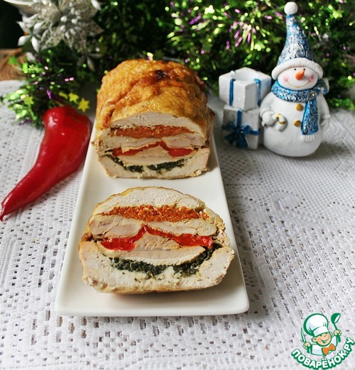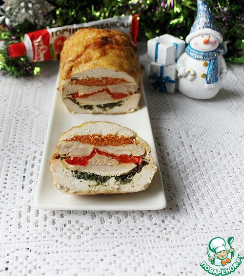 На новогодние праздники предлагаю приготовить куриный рулет. Этот рулет имеет очень красивый и аппетитный разрез. А какая у него румяная корочка! И приготовить его можно заранее. Подавать его лучше в холодном виде, так он будет хорошо и красиво нарезаться.