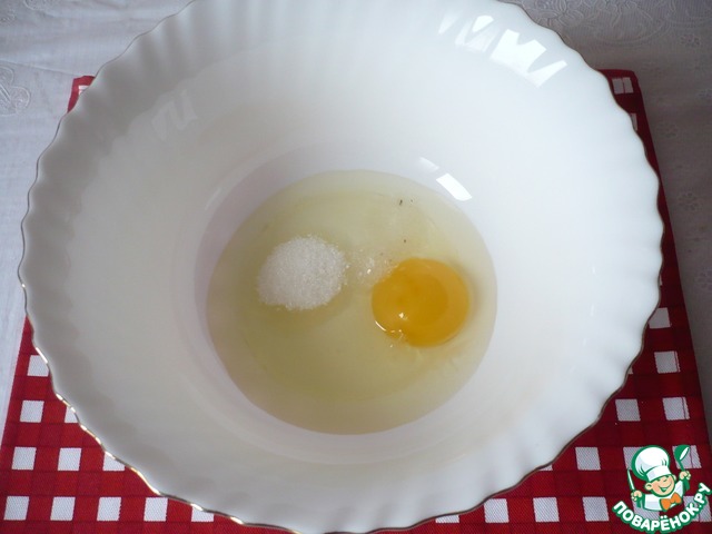 В миску вбить яйцо, добавить соль и сахар. Все хорошо перемешать венчиком.