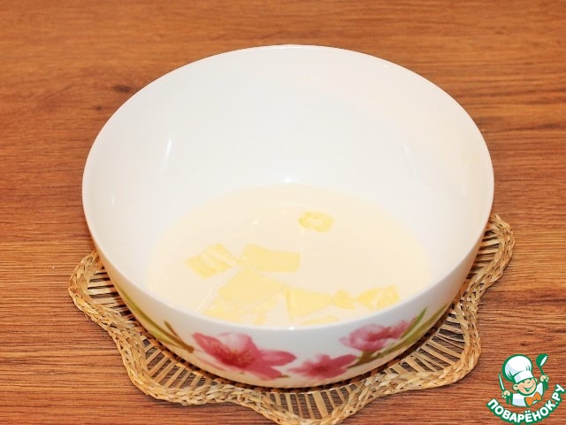 1. Приготовим тесто. В горячем молоке растапливаем масло (20 г).