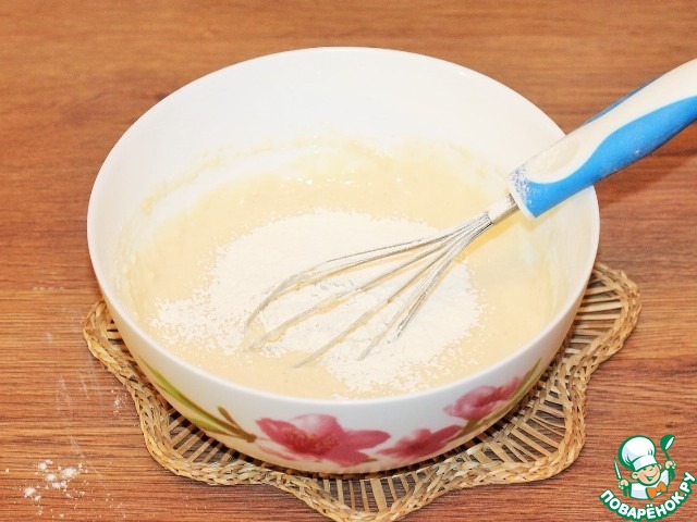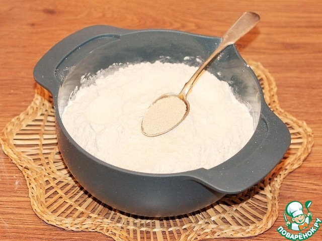 3. 2/3 части муки смешиваем с сухими дрожжами и перемешиваем венчиком.