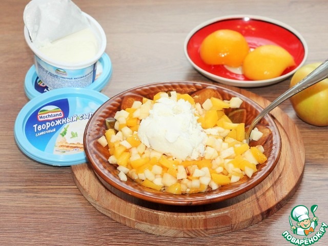 7. Приготовим начинку. Яблоко очищаем от шкурки и семечек. Консервированные персики и яблоко нарезаем маленькими кубиками и смешиваем с творожным сыром (лучше добавить по вкусу) и 1 ст. л. яичного белка. Сахар добавляем по вкусу. Я заменила сахар на густой джем и добавила по вкусу. Убираем начинку в холодильник.