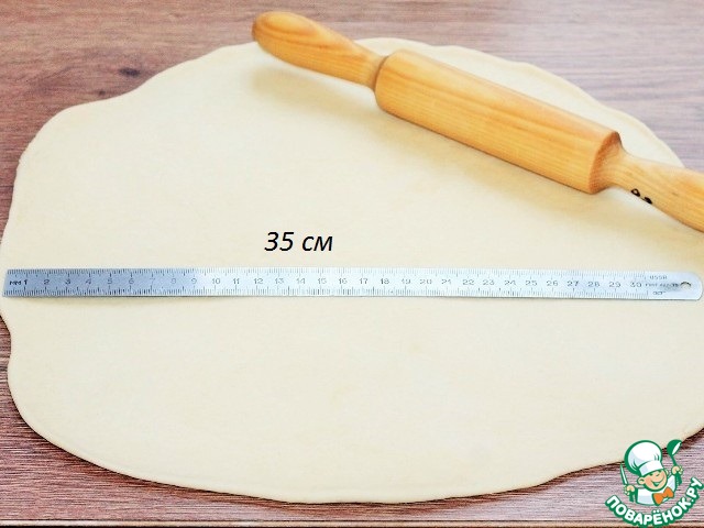 11. Раскатываем каждый колобок в пласт, размер ~ 37 см. Столешницу не припыляем мукой.