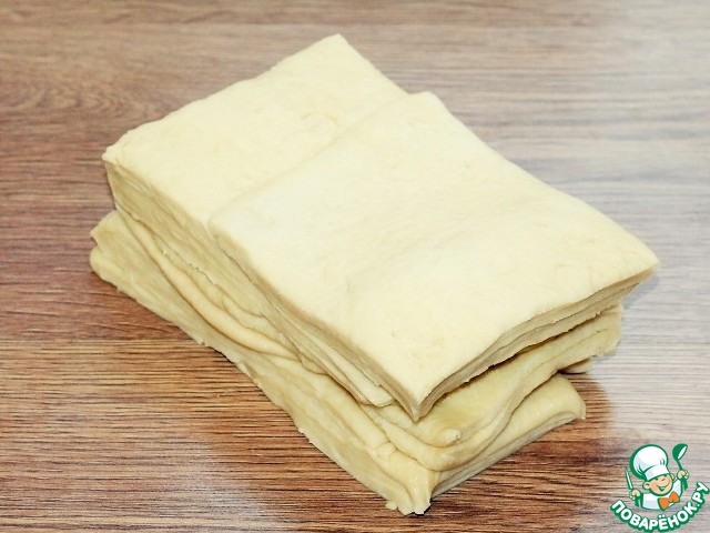 8. Приготовим слоеное тесто. Подошедшее тесто обминаем.