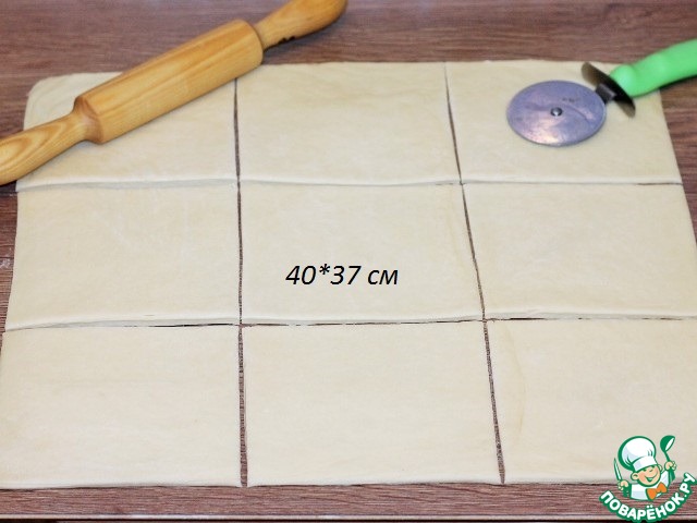 18. Охлажденное тесто раскатываем в пласт, края выравниваем и обрезаем до размера ~ 40*37 см. Обрезки скатываем и кладем в пакет. Делим тесто на 9 частей, кладем на разделочную доску и закрываем плёнкой.