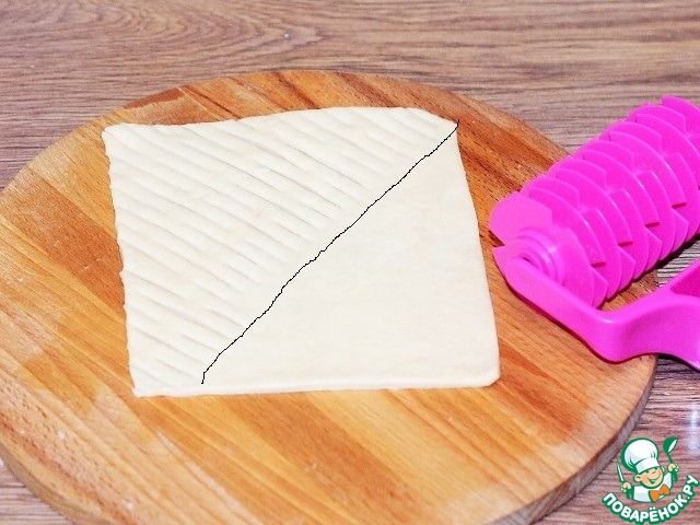 19. Формируем пироги. Берем по 1 части теста и фигурным роликом надрезаем сеточку на 1/2 части прямоугольника.