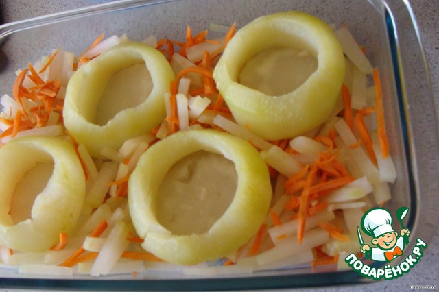 Сердцевинки кольраби и морковь порезать полосками, уложить в форму, усадить на "подушку" наши шкатулочки