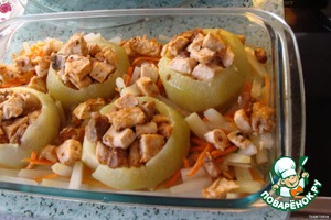заполнить их начинкой. Я порезала кубиками мясо индюшки и добавила начинку из нее(грибы, лук. бекон и сухарики). Залить все готовым бульоном.