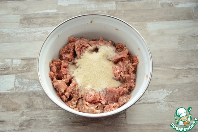 К фаршу добавьте 200 г лука, натертого на тёрке, соль, перец и хорошо перемешайте. После чего добавьте манную крупу, еще раз хорошо перемешайте и уберите в холодильник на 1 час, чтобы манка набухла.