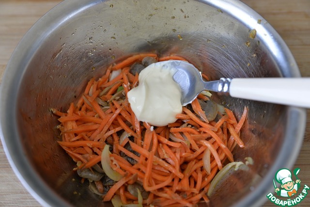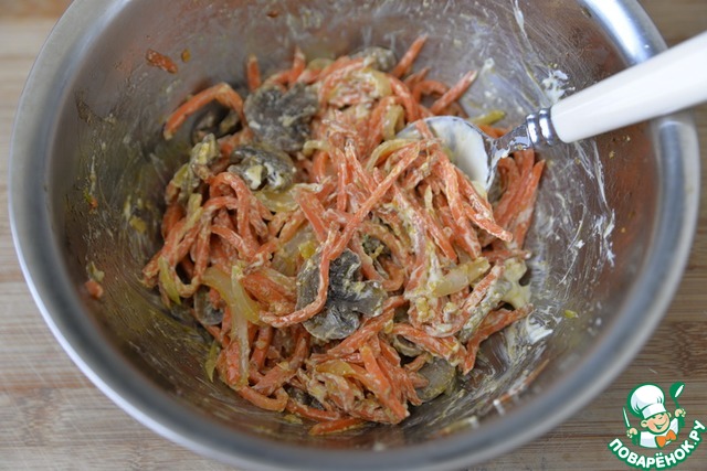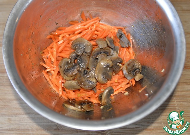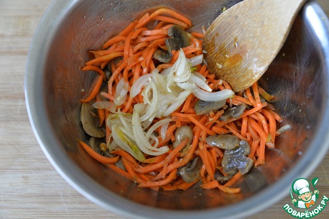 Кладём жареные грибы к моркови.