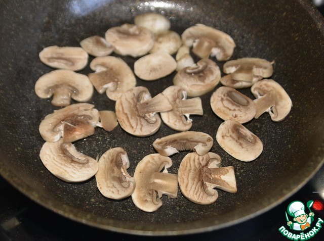 Шампиньоны моем, обсушиваем, режем сегментами, обжариваем на растительном масле до румяности.