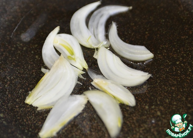 Лук чистим, режем стрелками, обжариваем до прозрачности. Можно грибы и лук жарить одновременно.