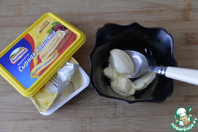 Для заправки салата смешиваем майонез и плавленный сыр. У меня Hochland. Хорошо перемешиваем.