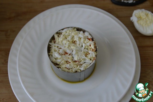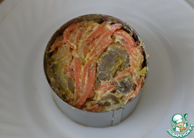 Я делала порционно. Кулинарное кольцо ставим на тарелку, кладём салат, утрамбовываем. -