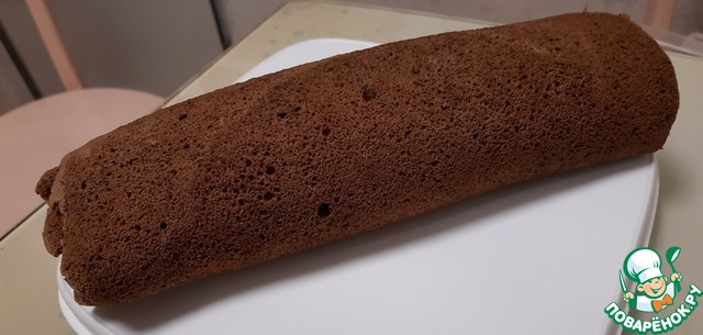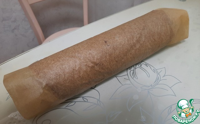 Испеченный корж свернуть в рулет вместе с пергаментом и обернуть в полотенце. Оставить до полного остывания.