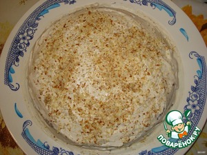 Намазала коржи. Для красоты посыпала сверху измельченным миндалем. Трот почти сутки простоял в холодильнике. Сегодня попробовали. Для тех, кто ест не очень пропитанный торт очень подойдет.