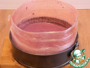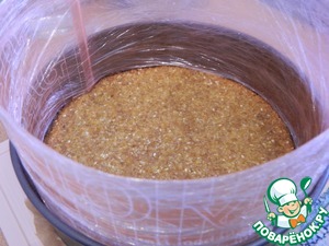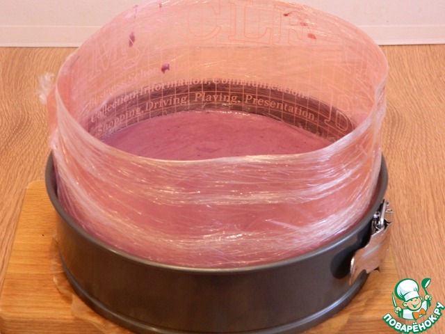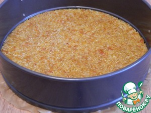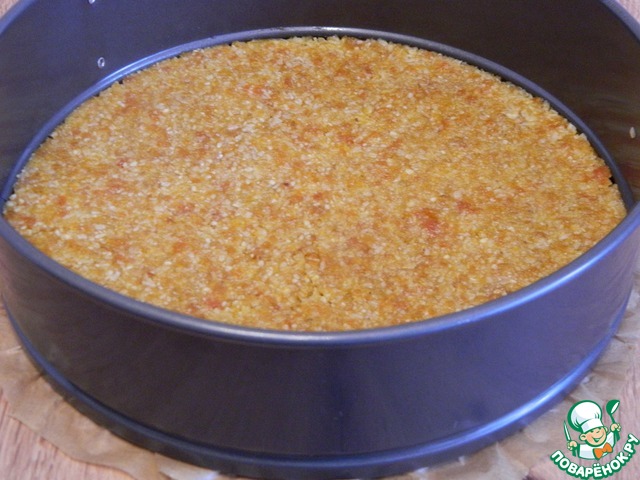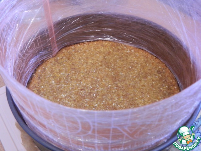 Выложим в разьемную форму 18 мм тесто коржа, уплотним толкушкой массу. Поставим в нагретую ранее духовку до 180 градусов и выпекаем корж 15-20 минут
