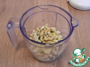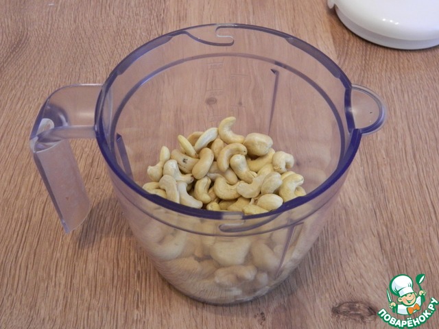Кешью небходимо замочить на ночь, тогда они лучше перемалываются. Орехи кешью всыпим в блендер.