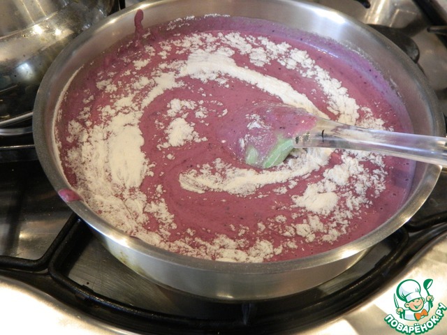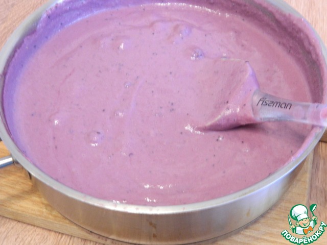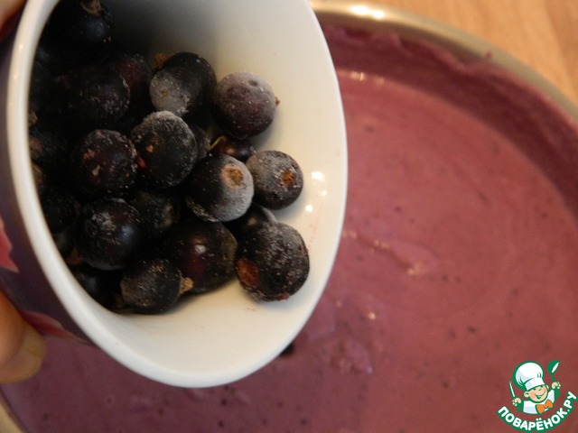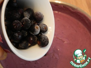 Снимем с огня и всыпим горсть целых замороженных ягод смородины, чтобы они сохранили свою целостность в готовом чизкейке.