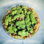 Для заправки авокадо измельчаем блендером, добавляем соль, перец по вкусу, йогурт, майонез и соевый соус.