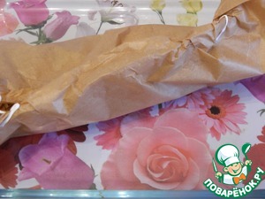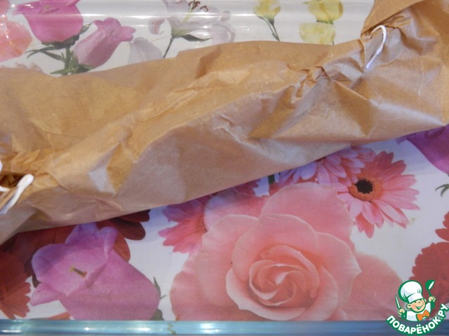 Завернем рыбу в пергамент и отправим в духовку на 30 минут. Запекаем при температуре 180 градусов.