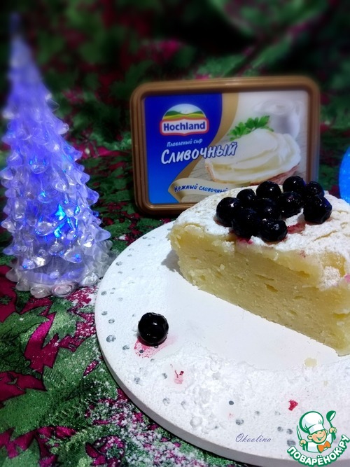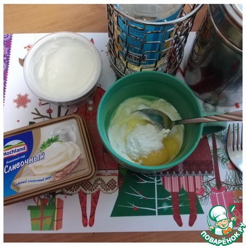 Выкладываем сыр. Я буду использовать плавленный сливочный сыр Hochland. Вилкой тщательно соединяем.