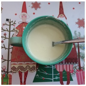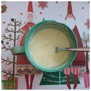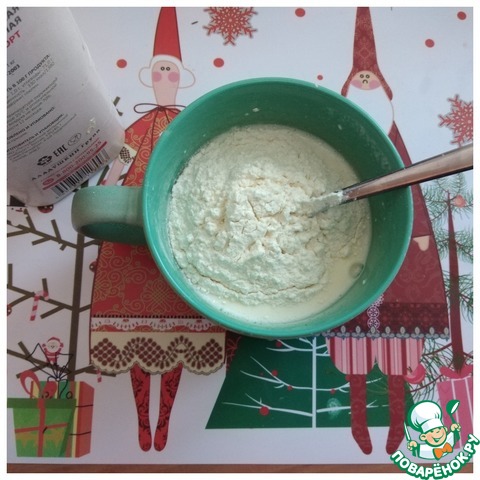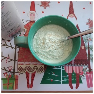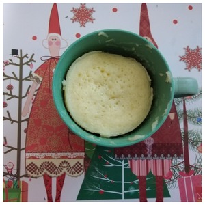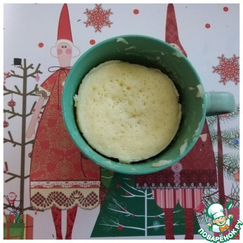 Кружку взять бульонную 350 мл и замешивать тесто в ней, а затем ставить эту же кружку в СВЧ, где замешивалось тесто. Отмерять продукты большой столовой ложкой и брать их в ложке без горки. Соединять продукты обычной вилкой и все поочерёдно, хорошо размешивая.