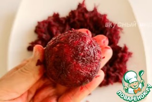 Салат скатать в форме шариков и каждый шарик обвалять в моркови, зелени и в свекле. Приятного аппетита!