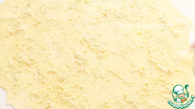 Достаем тесто из холодильника, очень тонко раскатать в прямоугольник. Смазать тесто растопленным сливочным маслом. Затем присыпать крошкой из печенья.