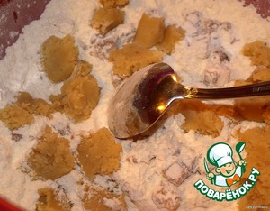 • Марципановую массу положить на 20 сек. в микровелку, тогда она легче смешивается с размягченным маслом, все это добавить в муку.
