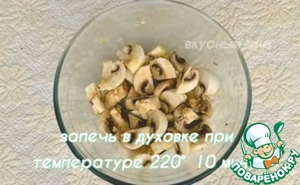 Шампиньоны чистим (не моем), нарезаем кубиком и заправить маслом, посолить, добавить чеснок и тщательно перемешать. Запечь в духовке при температуре 220° 10минут.