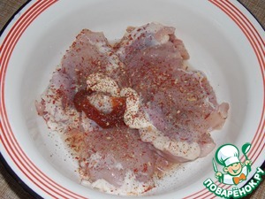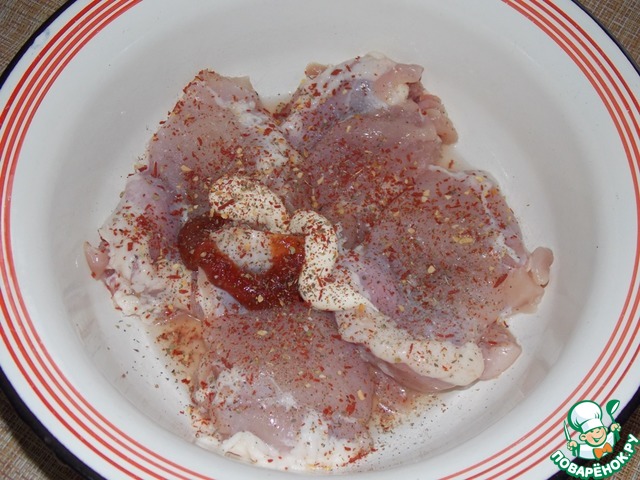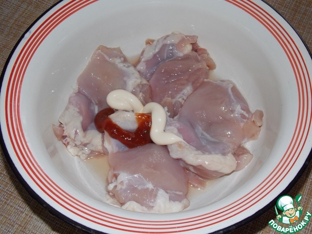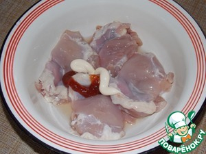 Куриные бедра помыть, убрать кожу. Выложить в миску, влить масло. Добавить майонез и кетчуп.