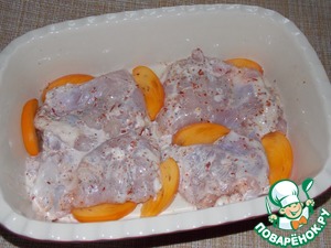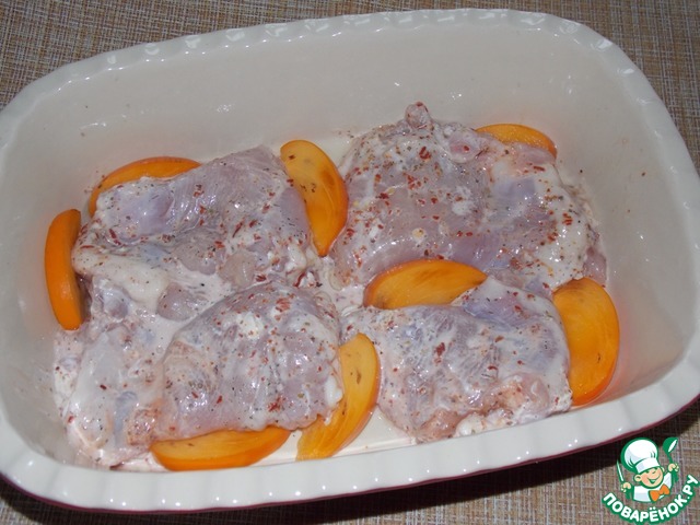 Выложить бедра в форму для запекания, смазанную маслом. Разложить кусочки хурмы, нарезанную небольшими ломтиками.
