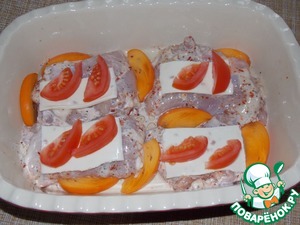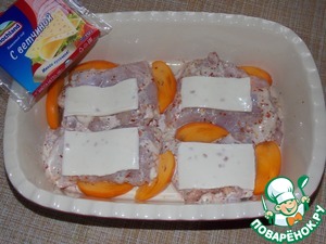 На каждое бедро выложить по пол ломтика плавленого сыра. Я использовала сыт Хохланд.