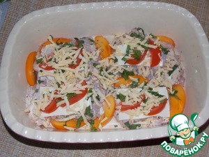 Сверху посыпать нарезанной зеленью петрушки и посыпать тертым, твердым сыром. Запечь при 180С, в течение 45-50 минут.