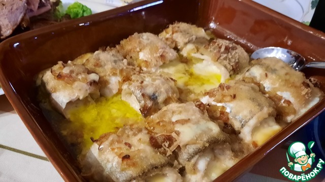 В огнеупорную форму положить половину жареного лука, на него рыбные заготовки.