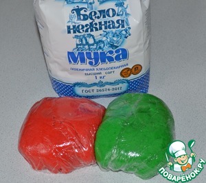 • Разделить тесто на 2 части: в одну добавить зеленый краситель, в другую - красный.