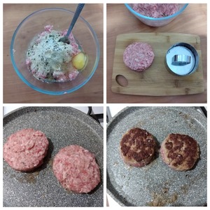 Фарш у меня говяжий. Добавила сухарей белых, соль и свежемолотый перец чёрный, разбила яйцо и хорошо вымесила. Сформировала котлеты, используя кольцо. Котлеты получились ровненькие. Обжарила котлеты с обеих сторон в небольшом количестве масла до готовности.